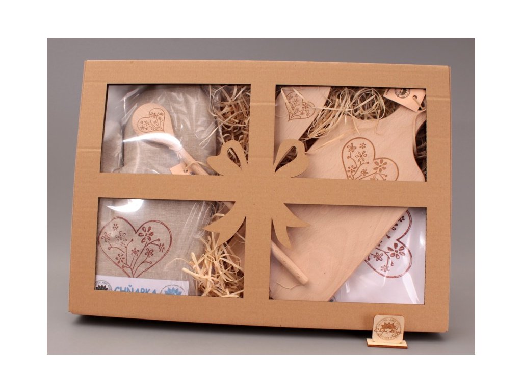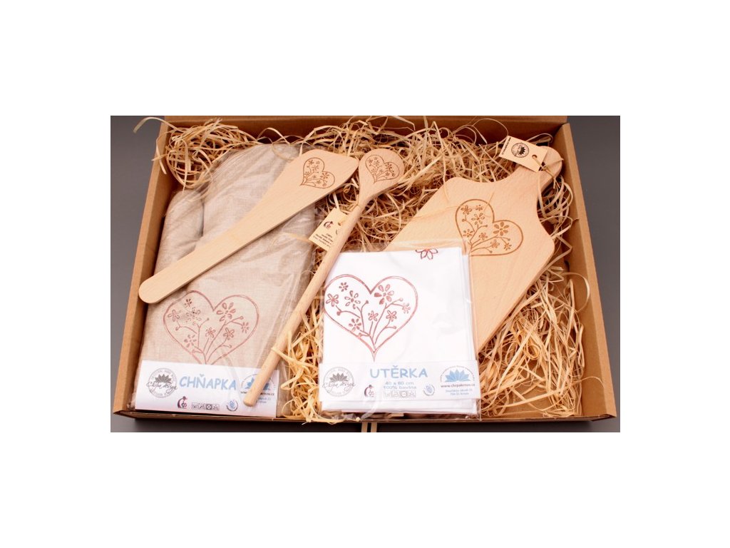 Dárková sada pro někoho, kdo rád vaří. Sada obsahuje prkénko, vařečku, obracečku, utěrku, chňapku. Textilní věci jsou vyrobeny z bavlněné látky a ruční tisk obrázku. Textil můžete prát na 40 stupňů. Dřevěné výrobky mají obrázek vypálený laserem. Určeno pro běžné použití.