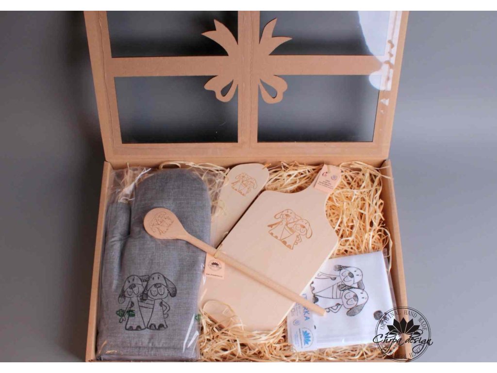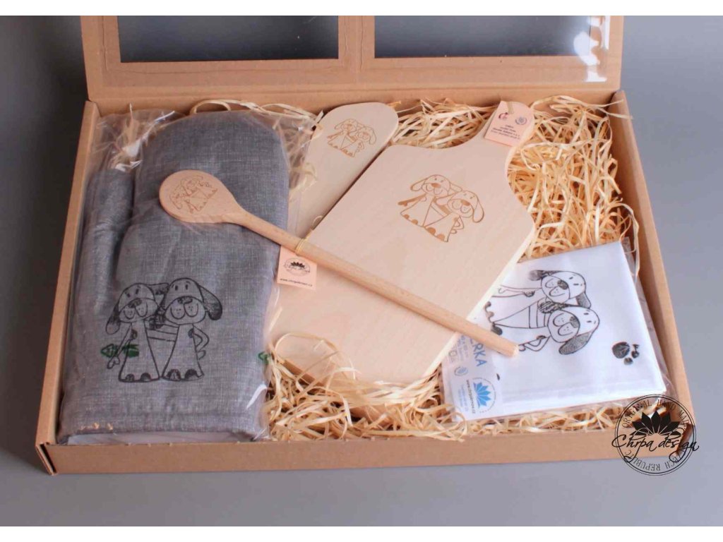 Dárková sada pro někoho, kdo rád vaří. Sada obsahuje prkénko, vařečku, obracečku, utěrku, chňapku. Textilní věci jsou vyrobeny z bavlněné látky a ruční tisk obrázku. Textil můžete prát na 40 stupňů. Dřevěné výrobky mají obrázek vypálený laserem. Určeno pro běžné použití.