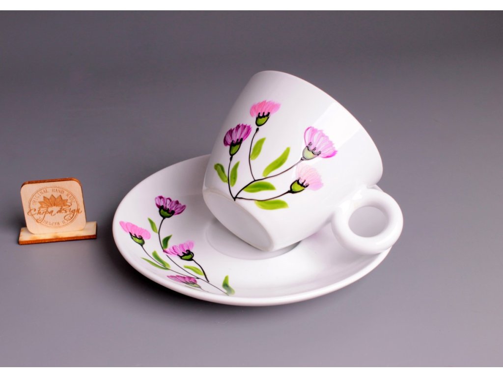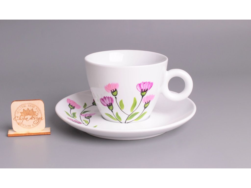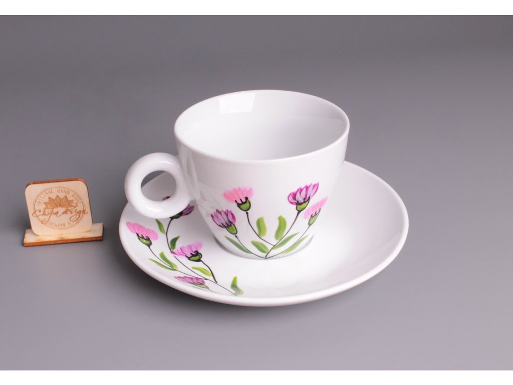 Šálek s podšálkem je vyroben z porcelánu a ručně malovaný. Dá se běžně používat a umývat běžným způsobem. Nedoporučujeme umývat v myčce na nádobí. Obsah 0,15 L.