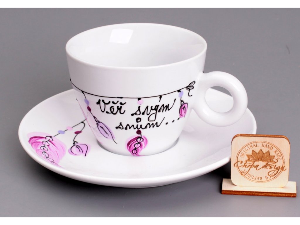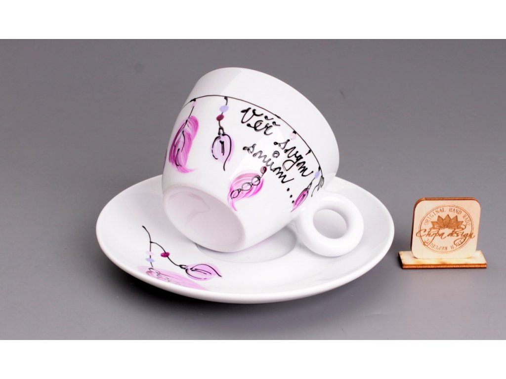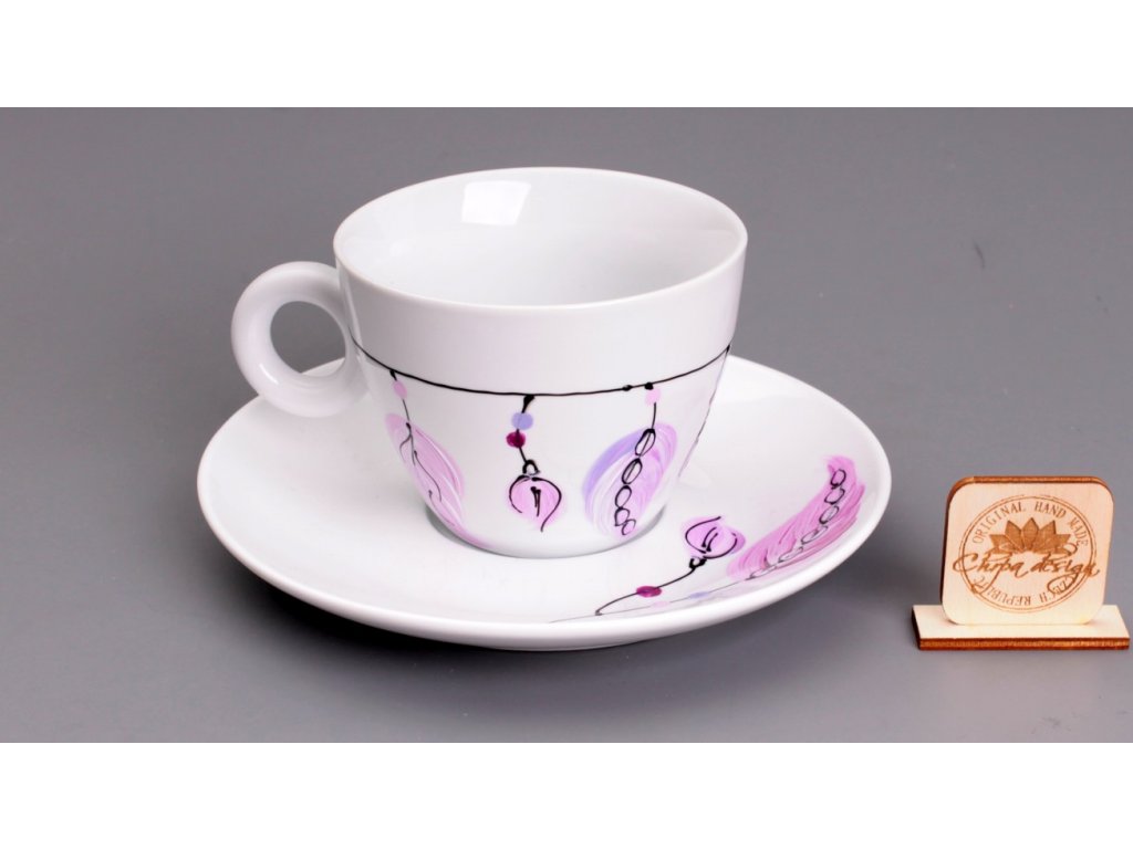 Šálek s podšálkem je vyroben z porcelánu a ručně malovaný. Dá se běžně používat a umývat běžným způsobem. Nedoporučujeme umývat v myčce na nádobí. Obsah 0,15 L.