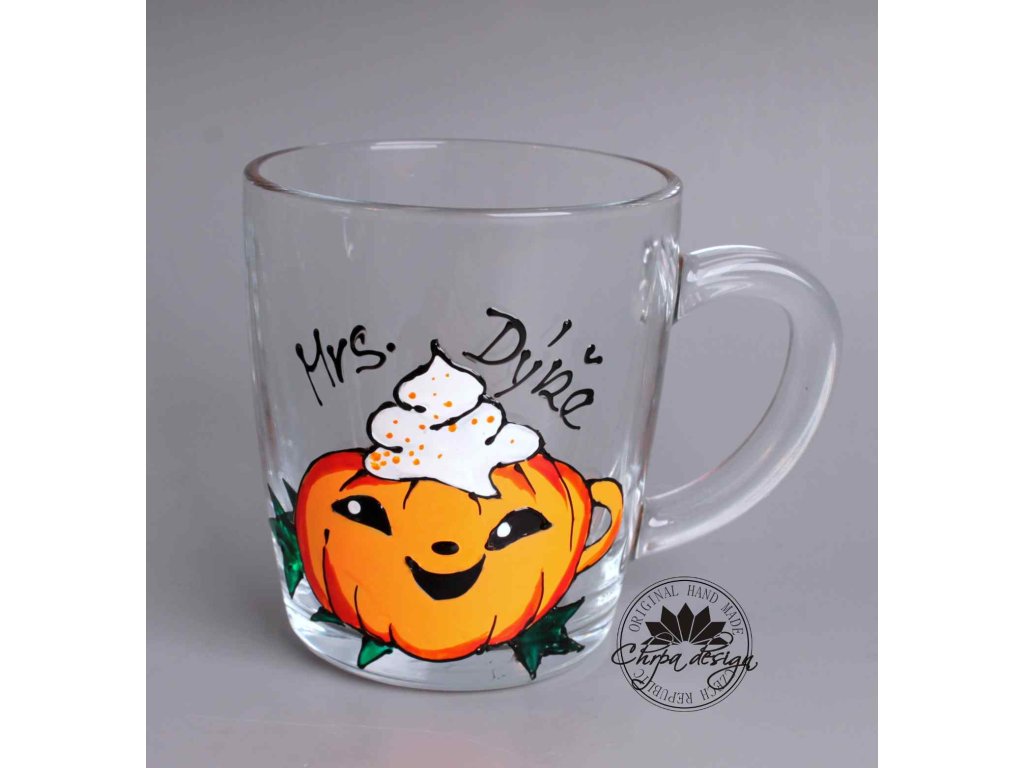 Originální ručně malovaný skleněný hrnek s motivem usměvavé dýně se šlehačkou. Tak akorát pro horkou čokoládu, čaj či spiced latté - to k podzimu vyloženě patří!