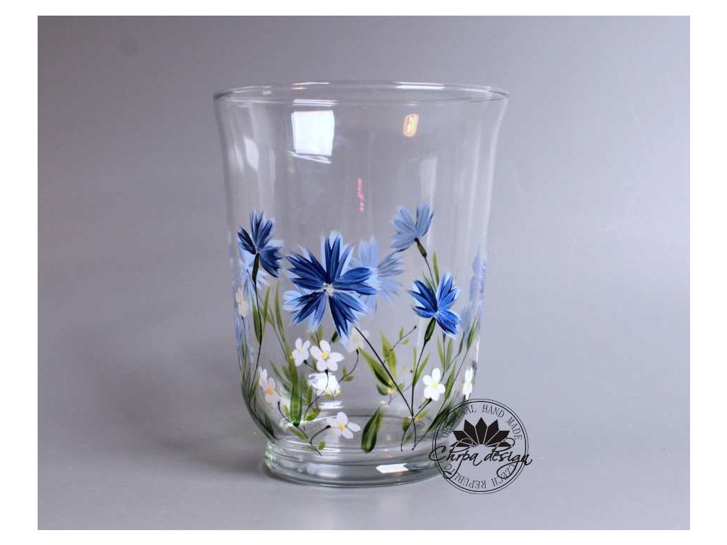 Skleněný, ručně malovaný velký svícen. Výška svícnu 18 cm a průměr svícnu 14 cm. Svícen se dá použít doma nebo třeba venku na terase.