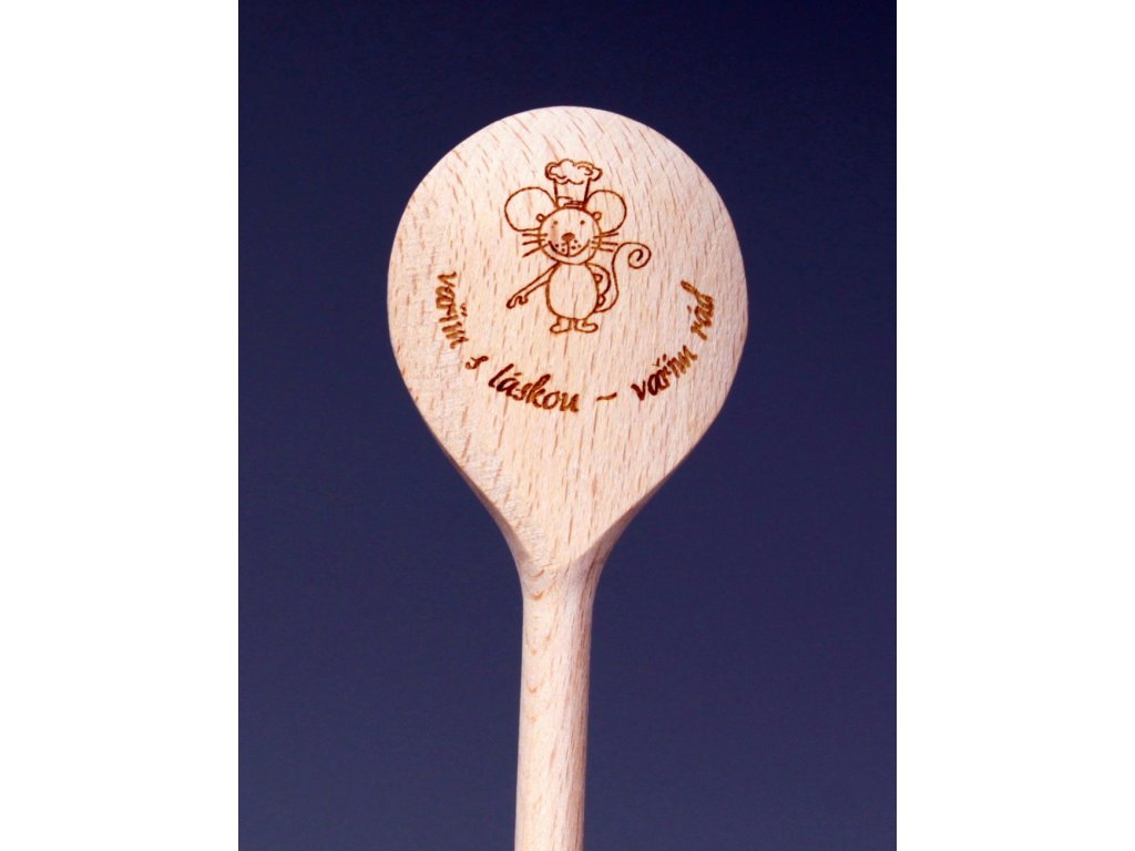 Dřevěná vařecha je vyrobena z bukového dřeva a má délku 30 cm. Obrázek je gravírovaný laserem. Vařecha je určena na běžné použití. Čištění vařechy doporučujeme jarovou vodou a nechat vyschnout.